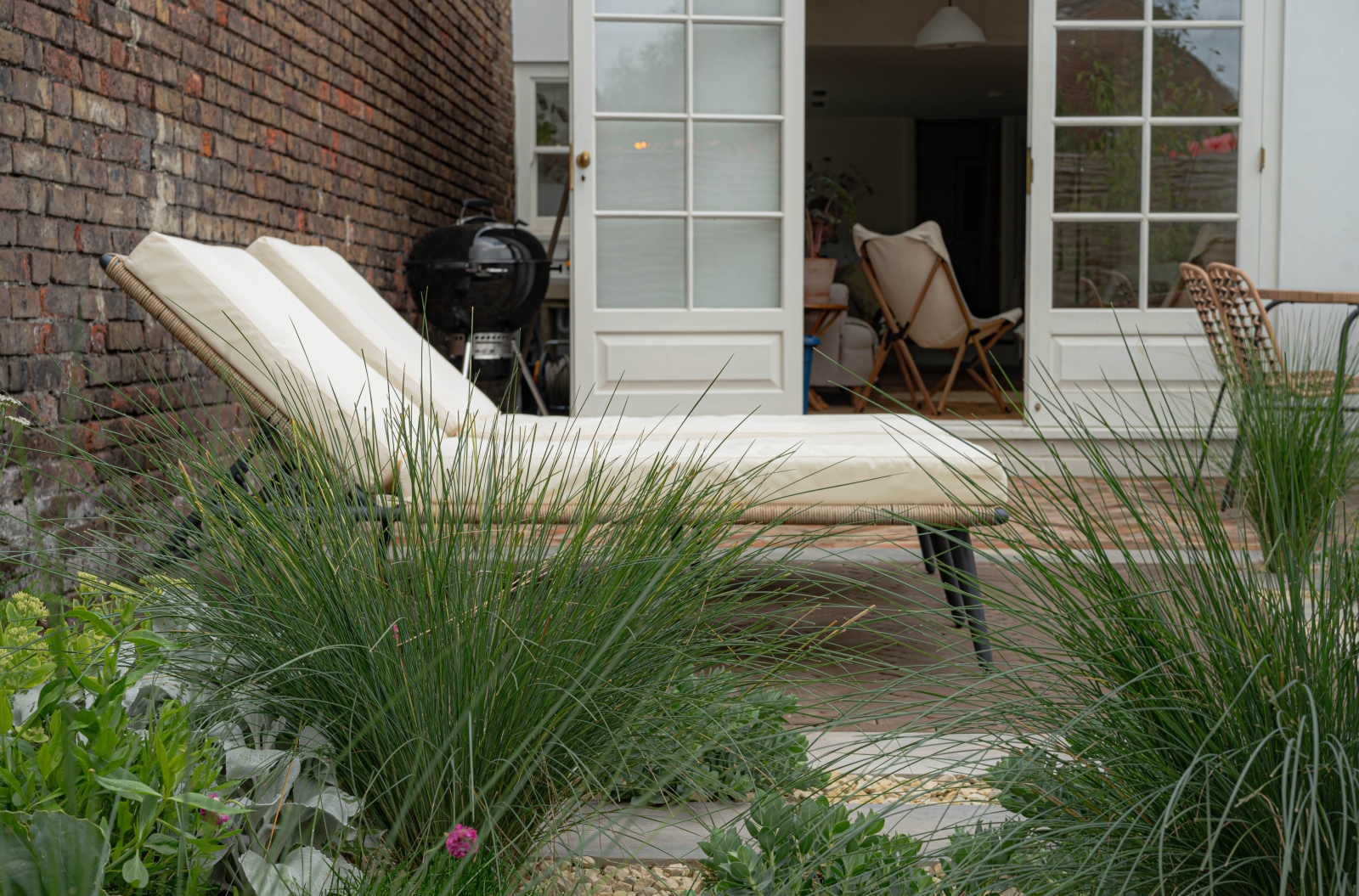 This garden, which is close to Deal Coast, was built for relaxing and dining. we included nice sunbeds for relaxing and a little dining area to eat outside with family and friends. The design was carefully thought out to make the most of the space while still keeping it open, which is great for living by the shore.